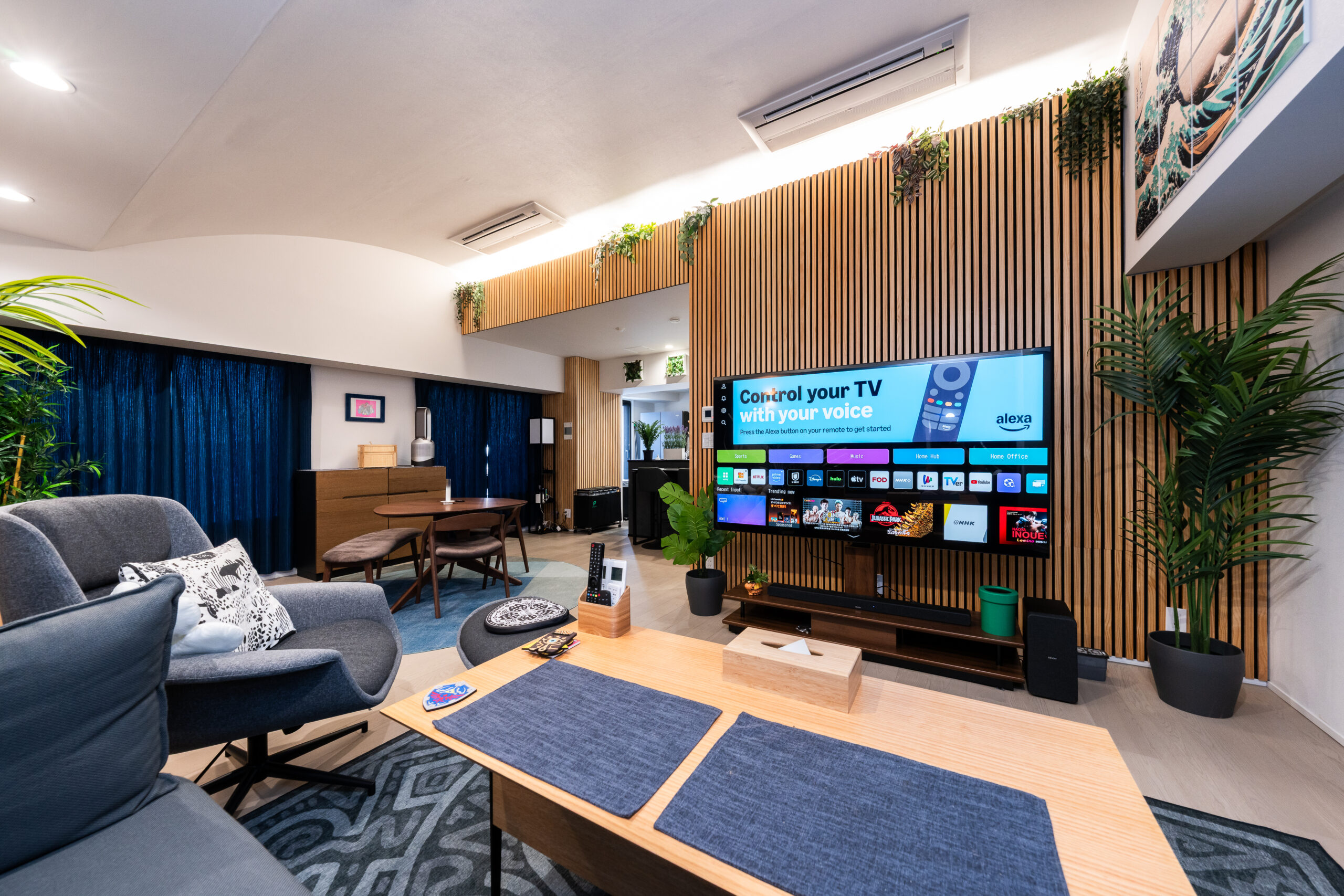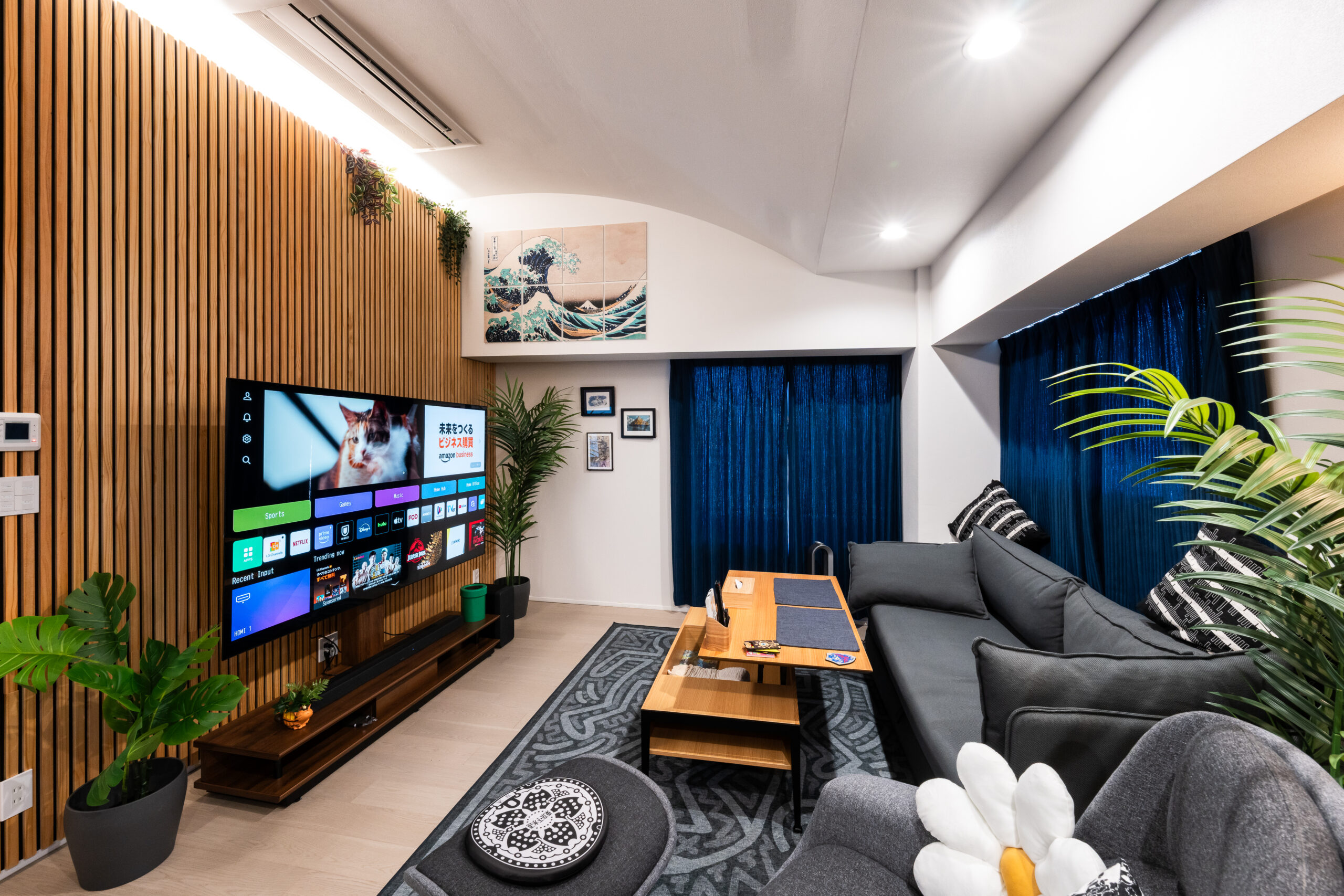 Close the blinds in the LDK to turn into “theater mode” and enjoy the stunning 77” LG OLED Smart TV with Denon Soundbar.
