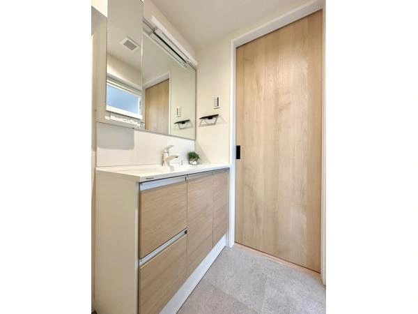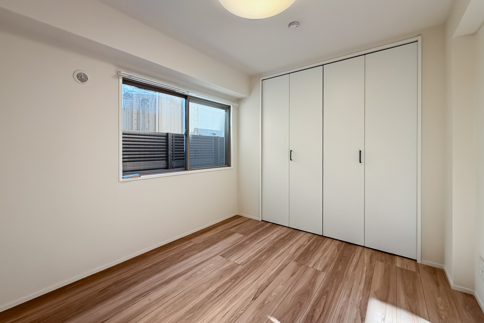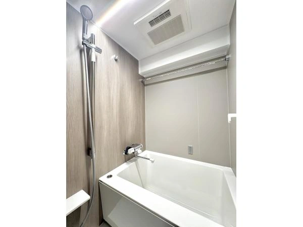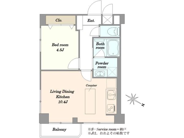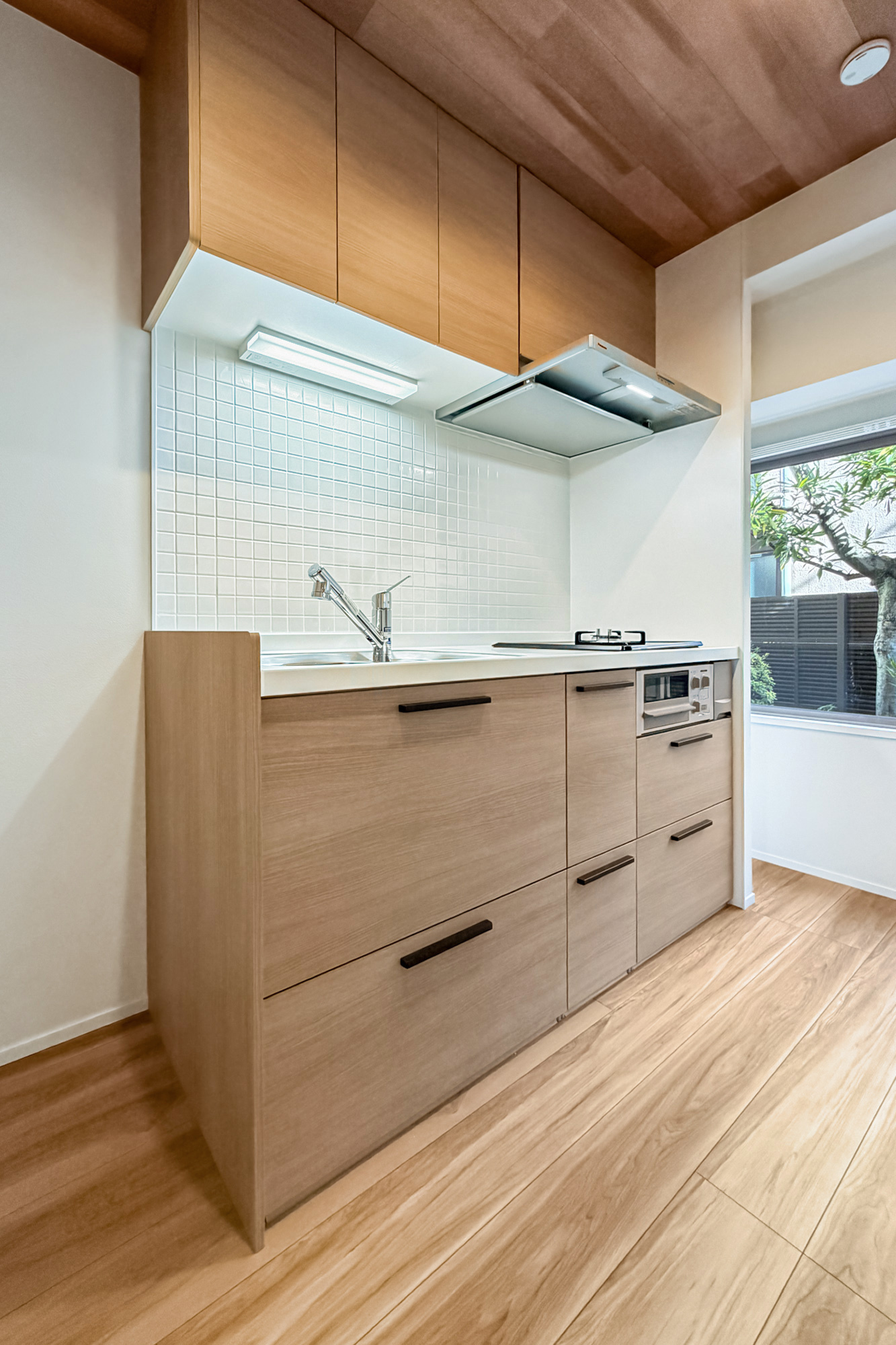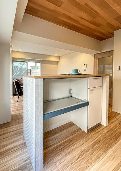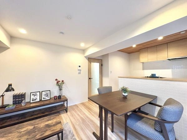 Inside, the 36.40㎡ layout has been fully renovated with a warm, understated palette. The 10.4-jyo living and dining area is centered around an open kitchen with a peninsula counter, creating a space that feels more social and open than its size suggests. Large windows bring in natural light, while the separate 4.5-jyo bedroom provides privacy without sacrificing efficiency. The renovation includes a new kitchen, bathroom, vanity, toilet, flooring, doors, and piping, making the apartment effectively move-in ready. Unlike many compact units in the area, this one feels calm, bright, and easy to live in rather than merely convenient.
